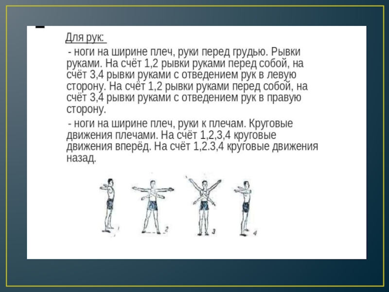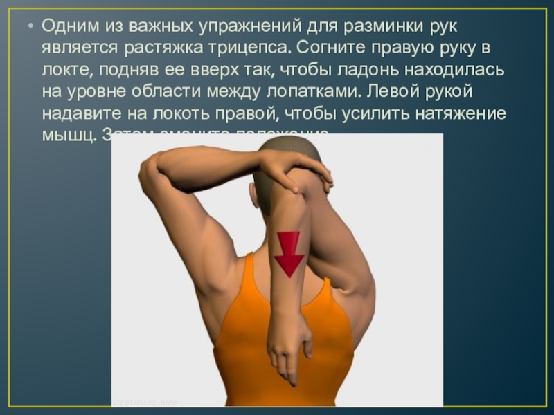 Слайд 10Одним из важных упражнений для разминки рук является растяжка трицепса. Согните