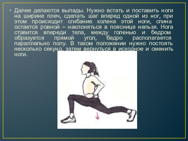 Слайд 20Далее делаются выпады. Нужно встать и поставить ноги на ширине плеч,