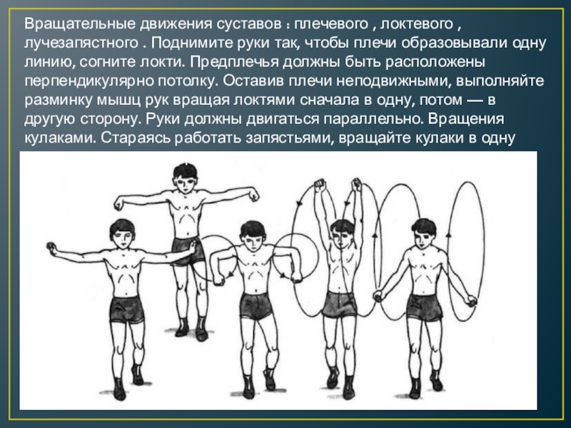 так, чтобы плечи образовывали одну линию, согните локти. Предплечья должны быть расположены перпендикулярно потолку. Оставив плечи неподвижными, выполняйте разминку мышц рук вращая локтями сначала в одну, потом — в другую сторону. Руки должны двигаться параллельно. Вращения кулаками. Стараясь работать запястьями, вращайте кулаки в одну сторону, в разные стороны, навстречу друг другу и т.д.