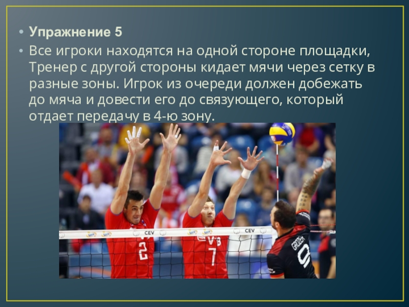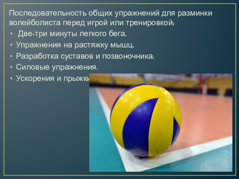 Слайд 5Последовательность общих упражнений для разминки волейболиста перед игрой или тренировкой: