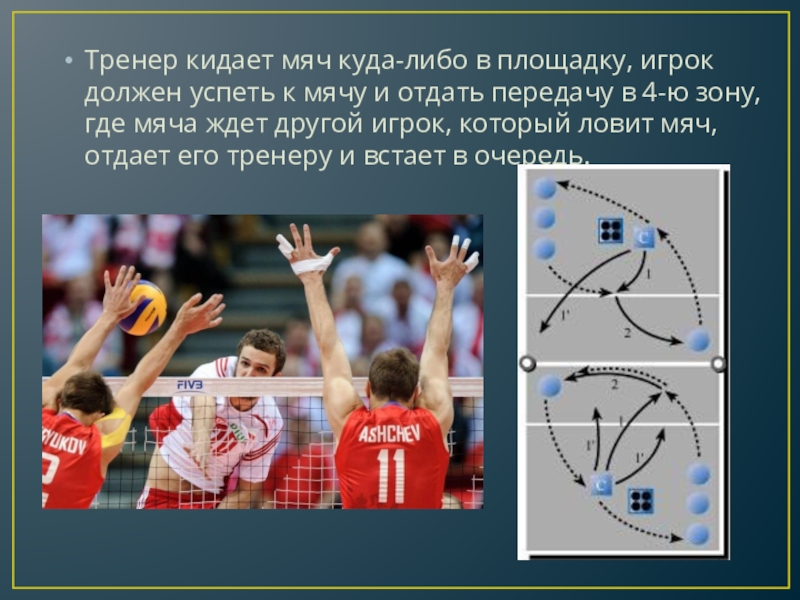 Слайд 35Тренер кидает мяч куда-либо в площадку, игрок должен успеть к мячу
