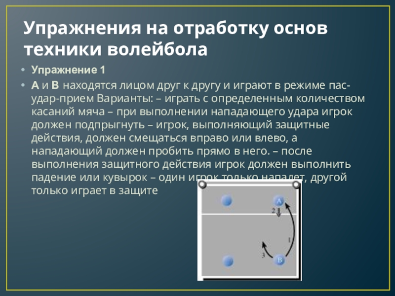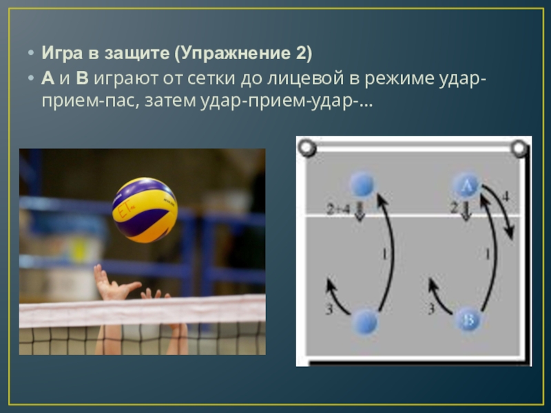 и играют в режиме пас-удар-прием Варианты: – играть с определенным количеством касаний мяча – при выполнении нападающего удара игрок должен подпрыгнуть – игрок, выполняющий защитные действия, должен смещаться вправо или влево, а нападающий должен пробить прямо в него. – после выполнения защитного действия игрок должен выполнить падение или кувырок – один игрок только нападет, другой только играет в защите