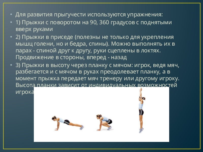 3) Прыжки в высоту через планку с мячом: игрок, ведя мяч, разбегается и с мячом в руках преодолевает планку, а в момент прыжка передает мяч тренеру или другому игроку. Высота планки зависит от индивидуальных возможностей игрока