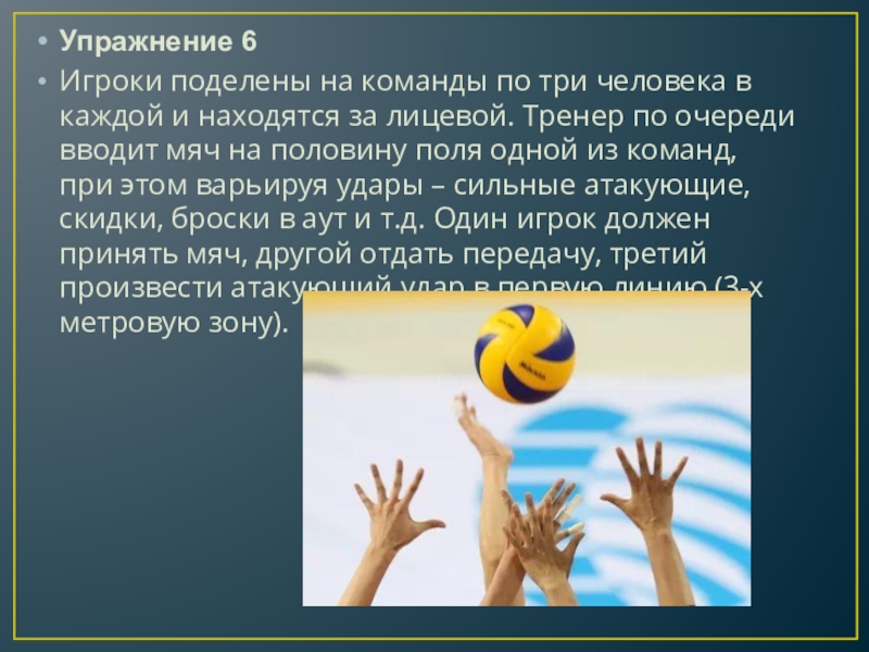 находятся за лицевой. Тренер по очереди вводит мяч на половину поля одной из команд, при этом варьируя удары – сильные атакующие, скидки, броски в аут и т.д. Один игрок должен принять мяч, другой отдать передачу, третий произвести атакующий удар в первую линию (3-х метровую зону).