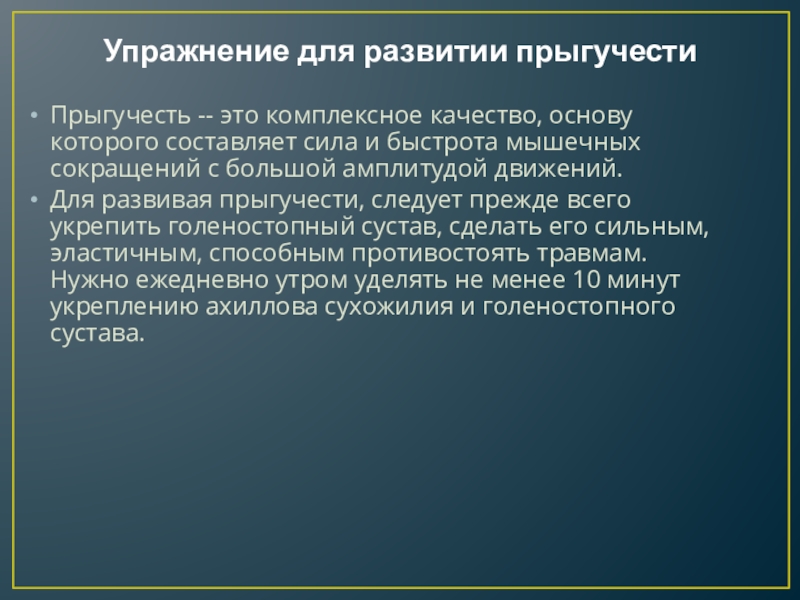 Для развивая прыгучести, следует прежде всего укрепить голеностопный сустав, сделать его сильным, эластичным, способным противостоять травмам. Нужно ежедневно утром уделять не менее 10 минут укреплению ахиллова сухожилия и голеностопного сустава.