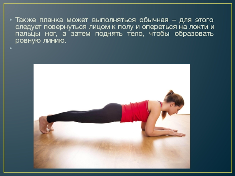 Слайд 22Также планка может выполняться обычная – для этого следует повернуться лицом