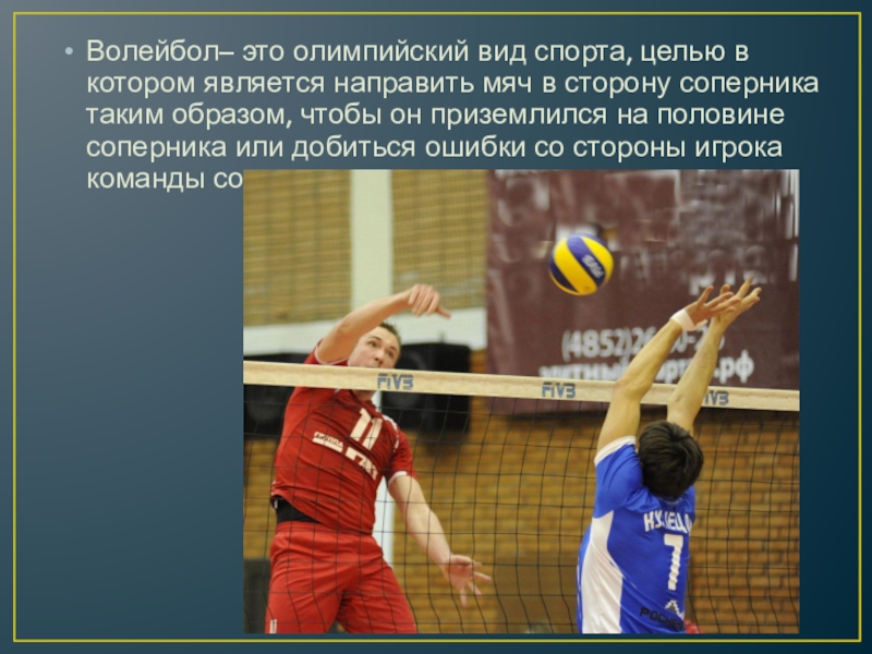 Слайд 4Волейбол– это олимпийский вид спорта, целью в котором является направить мяч
