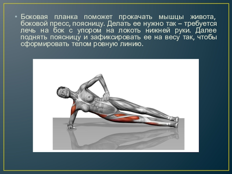 Слайд 21Боковая планка поможет прокачать мышцы живота, боковой пресс, поясницу. Делать ее