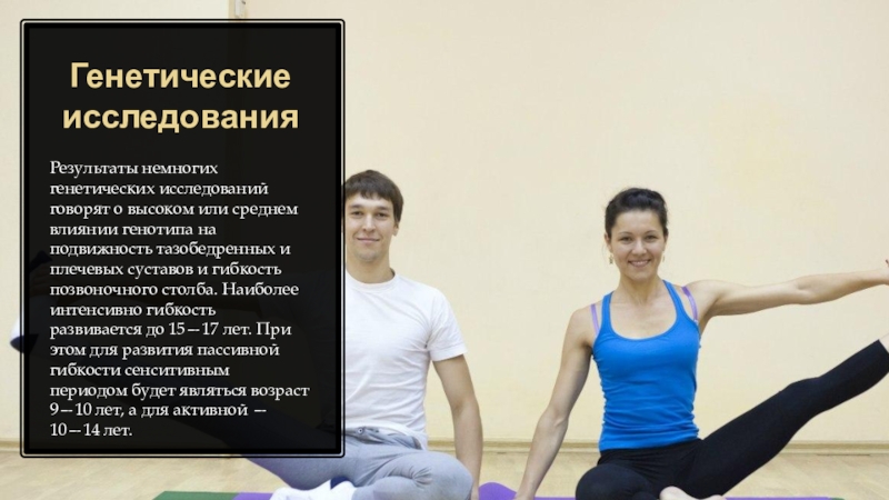 генотипа на подвижность тазобедренных и плечевых суставов и гибкость позвоночного столба. Наиболее интенсивно гибкость развивается до 15—17 лет. При этом для развития пассивной гибкости сенситивным периодом будет являться возраст 9—10 лет, а для активной — 10—14 лет.