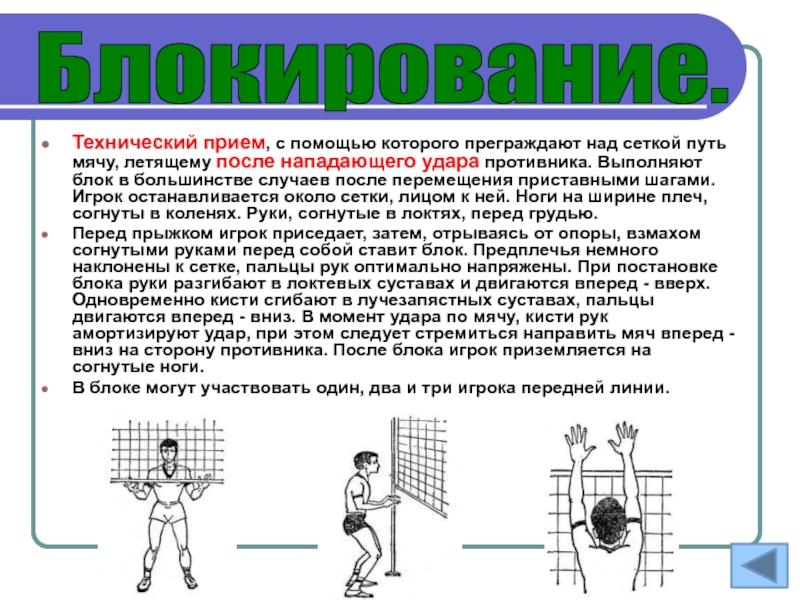 Технический прием, с помощью которого преграждают над сеткой путь мячу, летящему после нападающего удара противника. Выполняют блок
