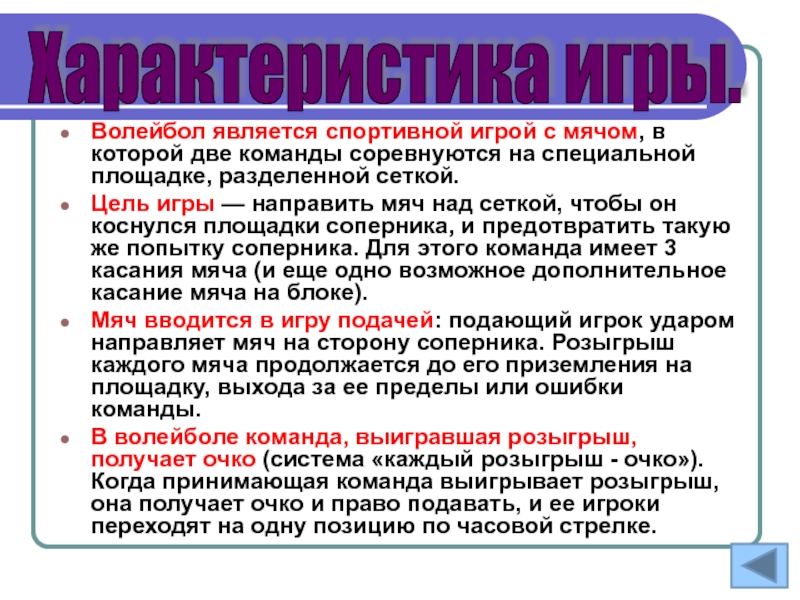 Волейбол является спортивной игрой с мячом, в которой две команды соревнуются на специальной площадке, разделенной сеткой. Цель