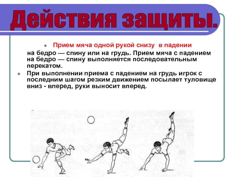 бедро — спину или на грудь. Прием мяча с падением на бедро — спину выполняется последовательным перекатом.