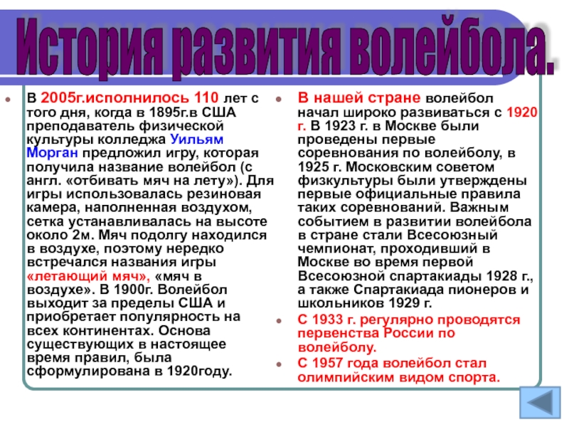 В 2005г.исполнилось 110 лет с того дня, когда в 1895г.в США преподаватель физической культуры колледжа Уильям Морган