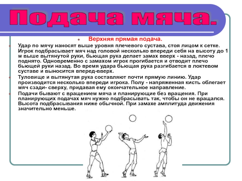 Верхняя прямая подача. Удар по мячу наносят выше уровня плечевого сустава, стоя лицом к сетке. Игрок