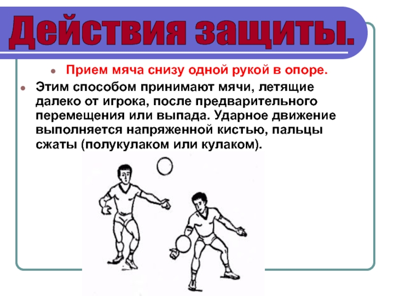 Прием мяча снизу одной рукой в опоре. Этим способом принимают мячи, летящие далеко от игрока, после предварительного