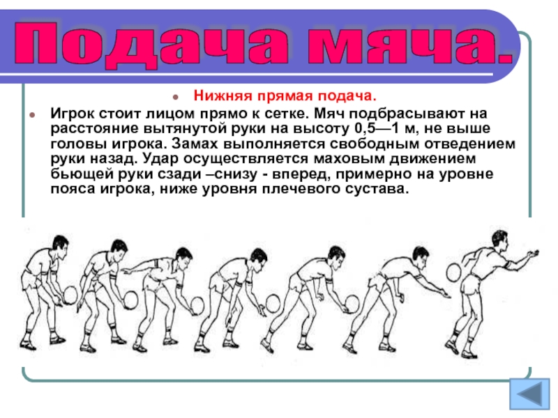 на расстояние вытянутой руки на высоту 0,5—1 м, не выше головы игрока. Замах выполняется свободным отведением руки назад. Удар осуществляется маховым движением бьющей руки сзади –снизу - вперед, примерно на уровне пояса игрока, ниже уровня плечевого сустава.