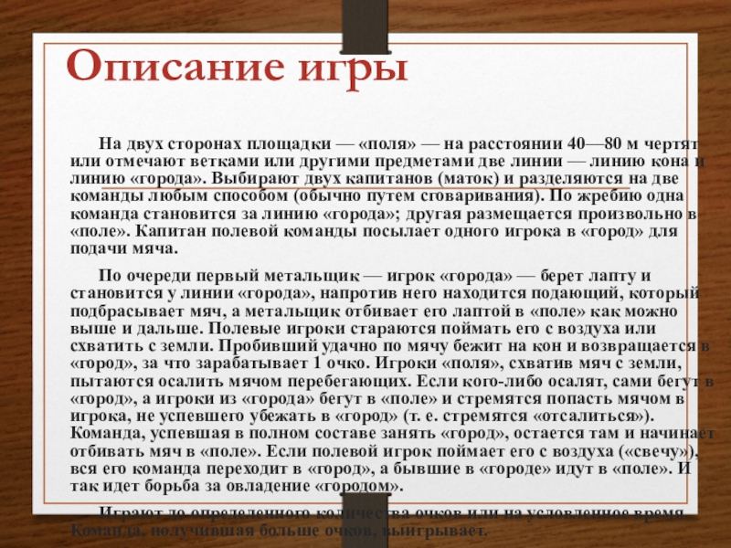 Если это игроку удается сделать до того, как водящий подбежит к палочке и схватит ее, то все ранее найденные игроки считаются вырученными, а водящий водит снова. Если же водящий, заметив подбегающего к палочке игрока, опередит его и первым схватит палочку, то такой игрок выходит из игры, как и все найденные до него, а водящий отправляется на поиски.