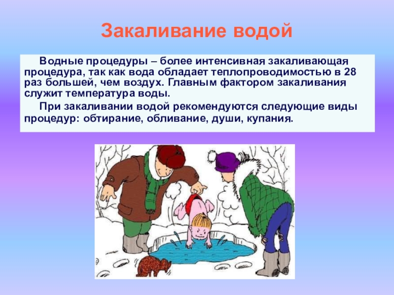 вода обладает теплопроводимостью в 28 раз большей, чем воздух. Главным фактором закаливания служит температура воды.