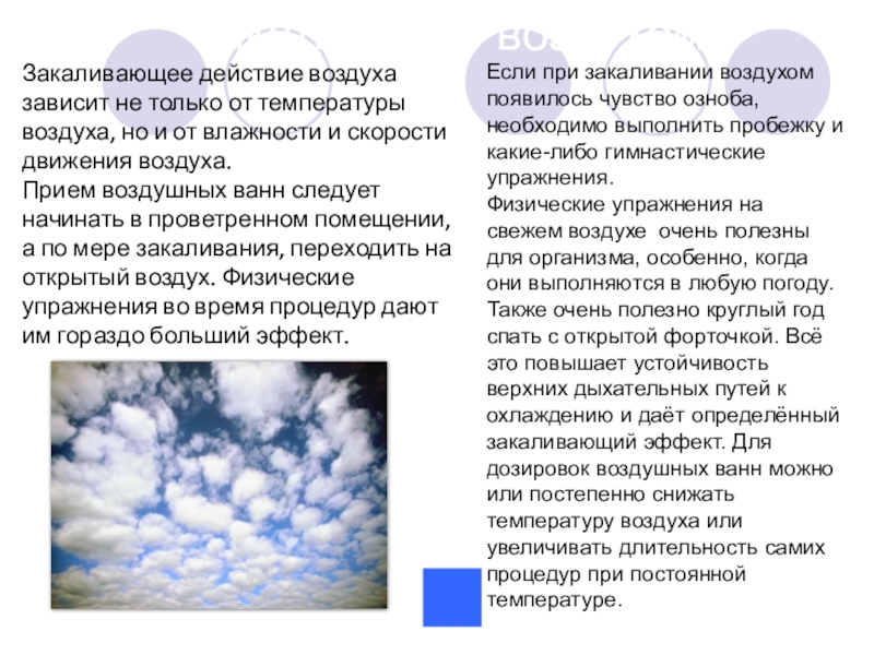 Воздушные процедуры с целью закаливания могут применяться либо в виде пребывания одетого человека на открытом воздухе, либо в виде воздушных ванн, при которых происходит кратковременное действие воздуха определенной температуры на обнаженную поверхность тела человека. Пребывание на свежем воздухе улучшает общее самочувствие человека, оказывая влияние на его эмоциональное состояние, вызывает чувство бодрости, свежести.