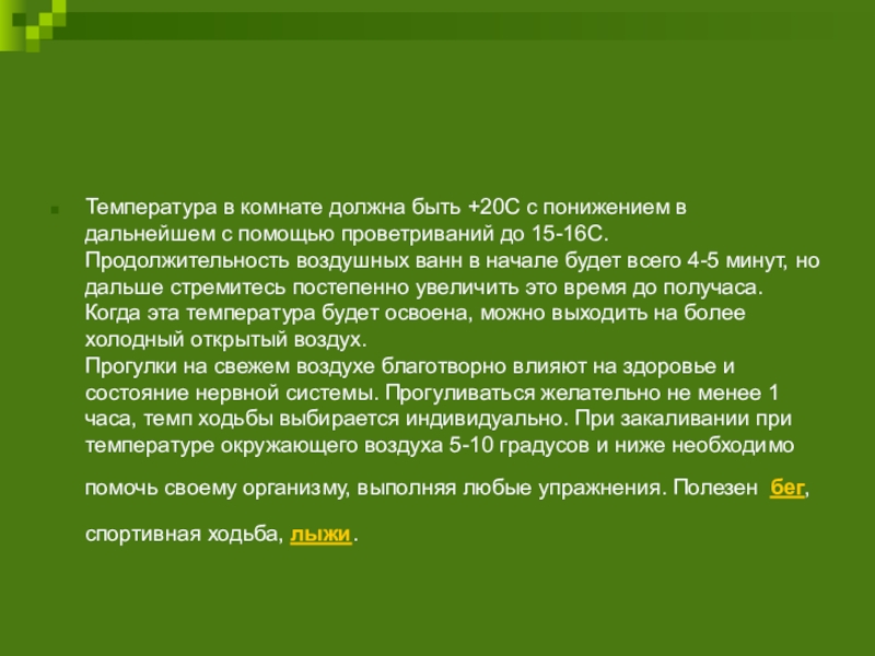 помощью проветриваний до 15-16С. Продолжительность воздушных ванн в начале будет всего 4-5 минут, но дальше стремитесь постепенно увеличить это время до получаса. Когда эта температура будет освоена, можно выходить на более холодный открытый воздух.