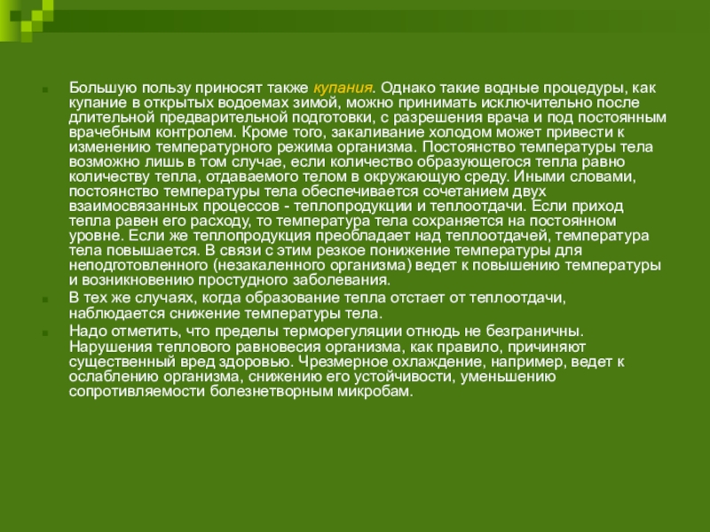 в открытых водоемах зимой, можно принимать исключительно после длительной предварительной подготовки, с разрешения врача и под постоянным врачебным контролем. Кроме того, закаливание холодом может привести к изменению температурного режима организма. Постоянство температуры тела возможно лишь в том случае, если количество образующегося тепла равно количеству тепла, отдаваемого телом в окружающую среду. Иными словами, постоянство температуры тела обеспечивается сочетанием двух взаимосвязанных процессов - теплопродукции и теплоотдачи. Если приход тепла равен его расходу, то температура тела сохраняется на постоянном уровне. Если же теплопродукция преобладает над теплоотдачей, температура тела повышается. В связи с этим резкое понижение температуры для неподготовленного (незакаленного организма) ведет к повышению температуры и возникновению простудного заболевания.