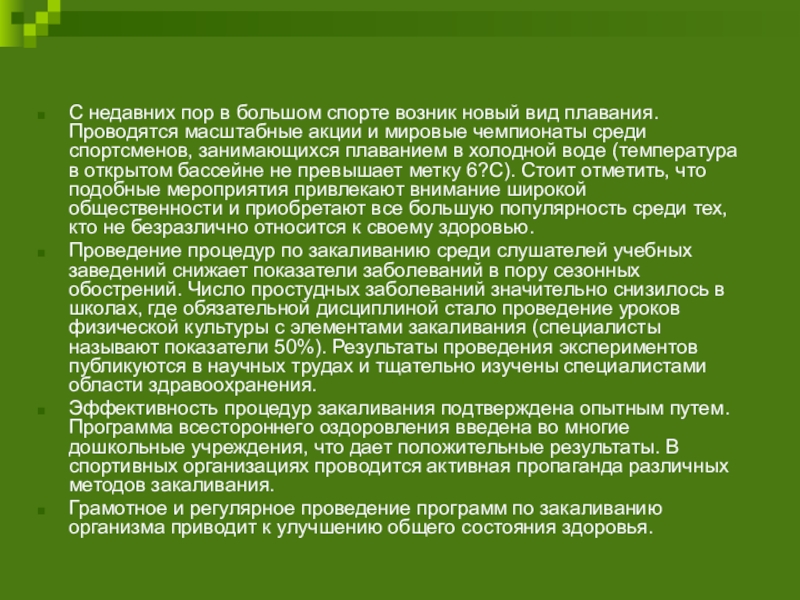 масштабные акции и мировые чемпионаты среди спортсменов, занимающихся плаванием в холодной воде (температура в открытом бассейне не превышает метку 6?С). Стоит отметить, что подобные мероприятия привлекают внимание широкой общественности и приобретают все большую популярность среди тех, кто не безразлично относится к своему здоровью.