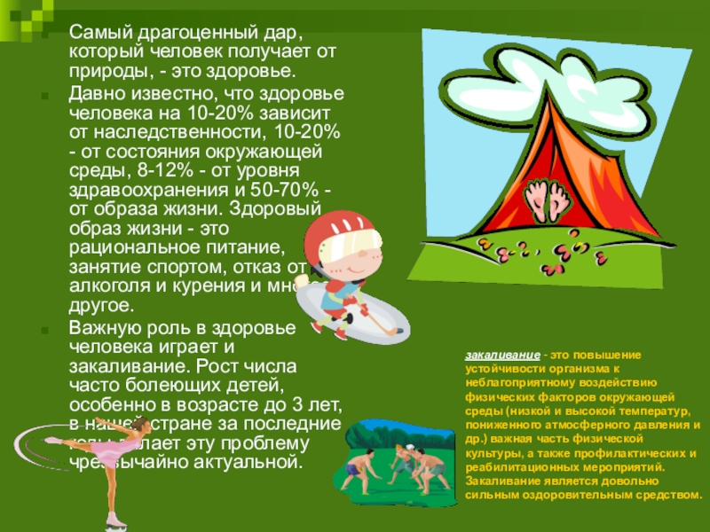 Важную роль в здоровье человека играет и закаливание. Рост числа часто болеющих детей, особенно в возрасте до 3 лет, в нашей стране за последние годы делает эту проблему чрезвычайно актуальной.