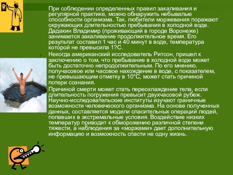 способности организма. Так, любители моржевания поражают окружающих длительностью пребывания в холодной воде. Дадакин Владимир (проживающий в городе Воронеже) занимается закаливание продолжительное время. Его результат составил 1 час и 40 минут в воде, температура которой не превысила 1?С.