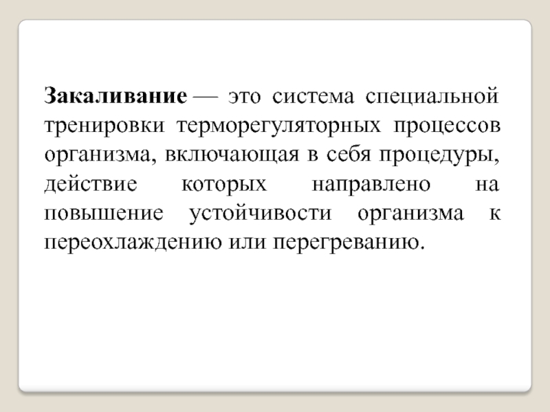 Слайд 2Закаливание — это система специальной тренировки терморегуляторных процессов организма, включающая в себя