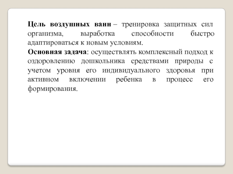 Цель воздушных ванн – тренировка защитных сил организма, выработка способности быстро адаптироваться к новым условиям.Основная задача: осуществлять комплексный