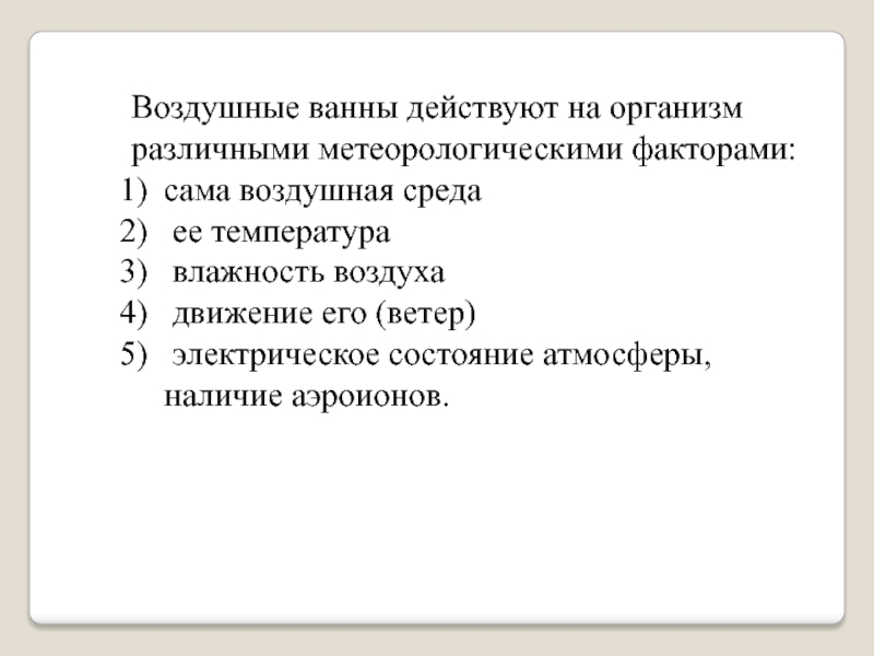 Воздушные ванны действуют на организм различными метеорологическими факторами:сама воздушная среда ее температура влажность воздуха движение его (ветер)