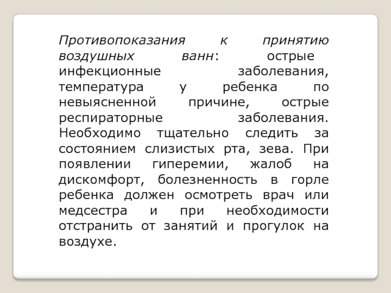 Слайд 11Противопоказания к принятию воздушных ванн: острые инфекционные заболевания, температура у ребенка