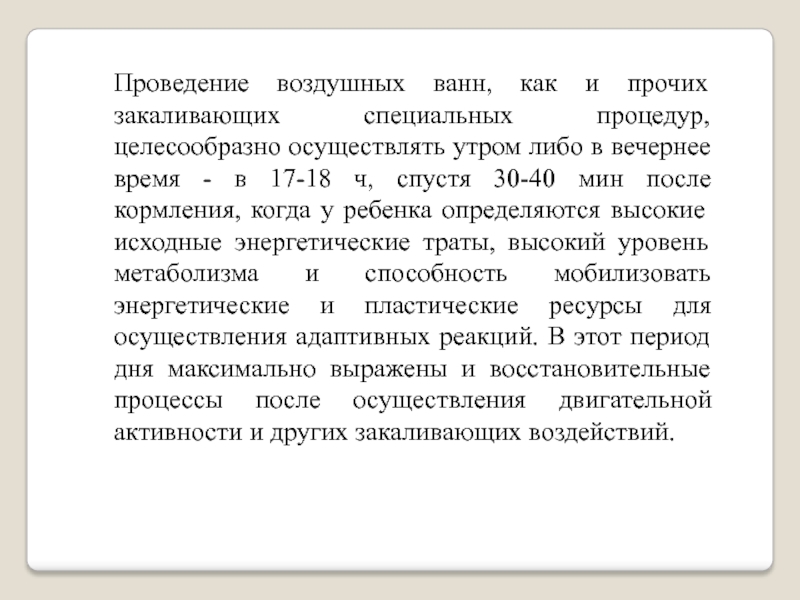 Слайд 10Проведение воздушных ванн, как и прочих закаливающих специальных процедур, целесообразно осуществлять