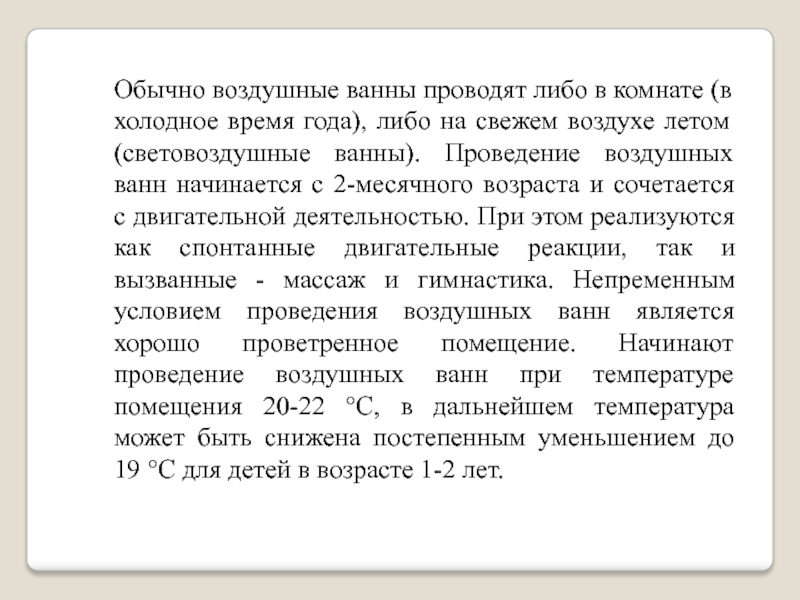 либо на свежем воздухе летом (световоздушные ванны). Проведение воздушных ванн начинается с 2-месячного возраста и сочетается с двигательной деятельностью. При этом реализуются как спонтанные двигательные реакции, так и вызванные - массаж и гимнастика. Непременным условием проведения воздушных ванн является хорошо проветренное помещение. Начинают проведение воздушных ванн при температуре помещения 20-22 °С, в дальнейшем температура может быть снижена постепенным уменьшением до 19 °С для детей в возрасте 1-2 лет.