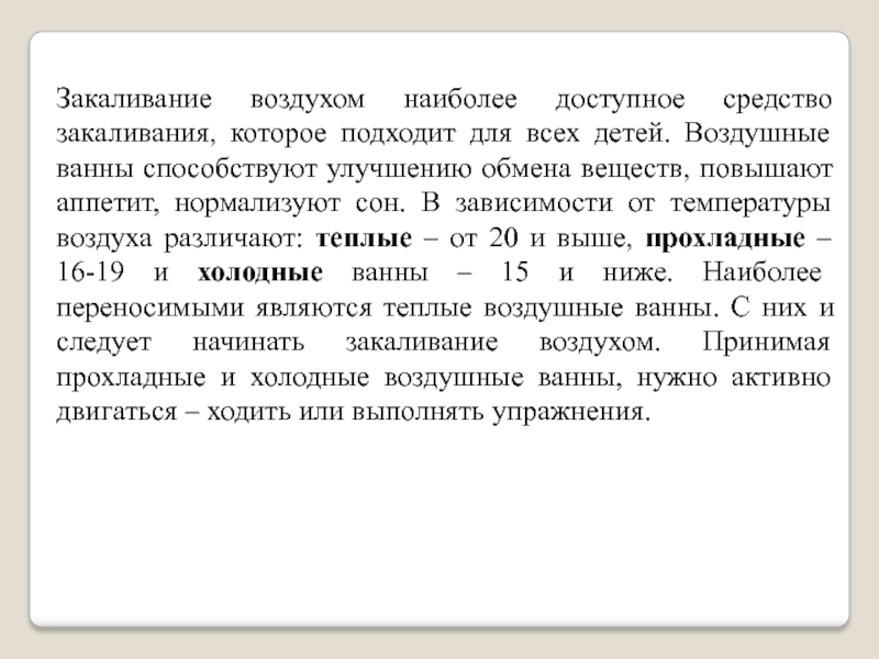 Слайд 8Закаливание воздухом наиболее доступное средство закаливания, которое подходит для всех детей.