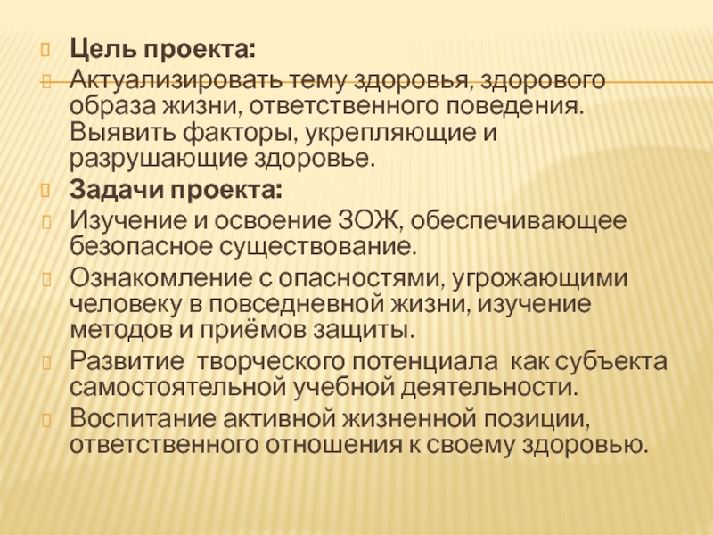 Цель проекта:Актуализировать тему здоровья, здорового образа жизни, ответственного поведения. Выявить факторы, укрепляющие и разрушающие здоровье.Задачи проекта:Изучение и
