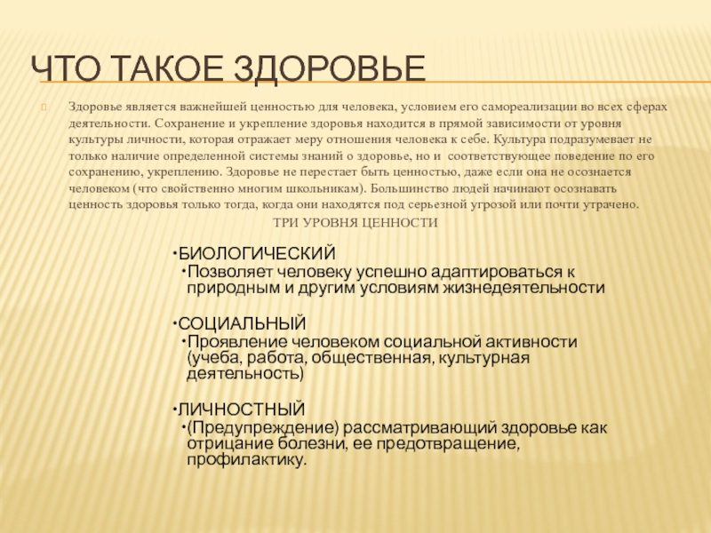 Что такое здоровьеЗдоровье является важнейшей ценностью для человека, условием его самореализации во всех сферах деятельности. Сохранение и