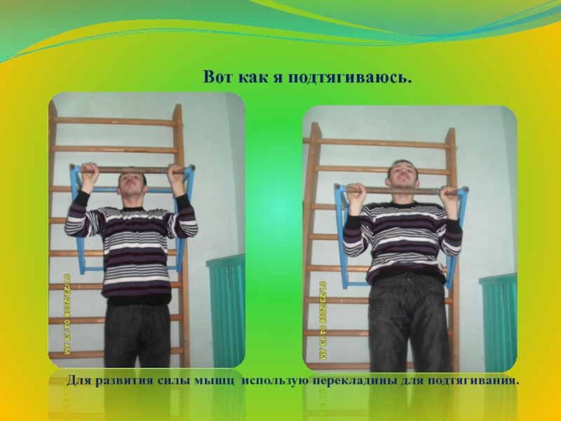 Вот как я подтягиваюсь.Для развития силы мышц использую перекладины для подтягивания.