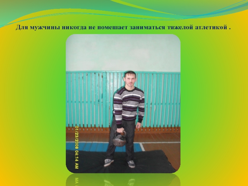 Слайд 9 Для мужчины никогда не помешает заниматься тяжелой атлетикой .