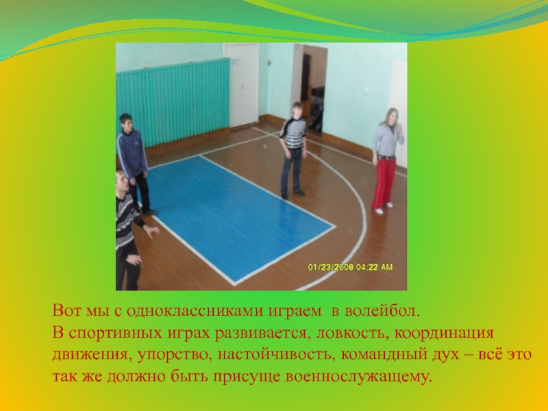 Вот мы с одноклассниками играем в волейбол. В спортивных играх развивается, ловкость, координация движения, упорство, настойчивость, командный