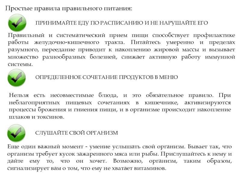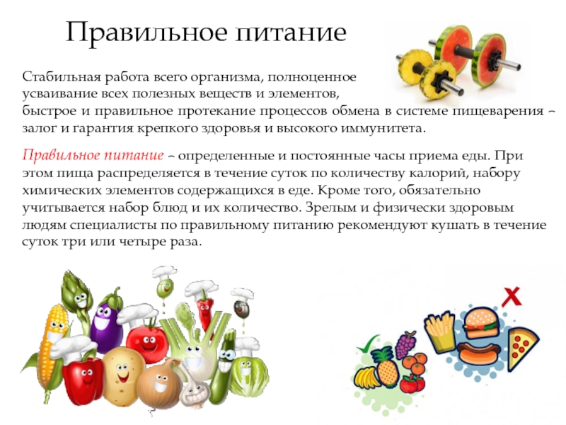 Правильное питание – определенные и постоянные часы приема еды. При этом пища распределяется в течение суток по количеству калорий, набору химических элементов содержащихся в еде. Кроме того, обязательно учитывается набор блюд и их количество. Зрелым и физически здоровым людям специалисты по правильному питанию рекомендуют кушать в течение суток три или четыре раза.