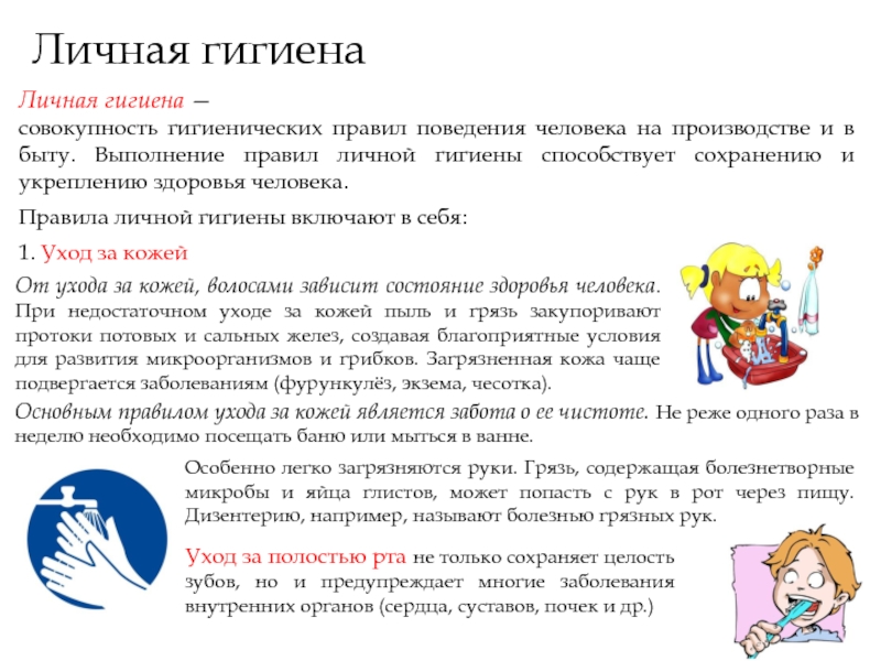 Гигиенические навыки следует прививать уже в детстве, закреплять в школьные годы и прочно вводить в распорядок дня с начала трудовой деятельности.