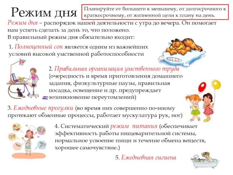 2. Правильная организация умственного труда (очередность и время приготовления домашнего задания, физкультурные паузы, правильная посадка, освещение и др. предупреждает возникновение переутомлений)