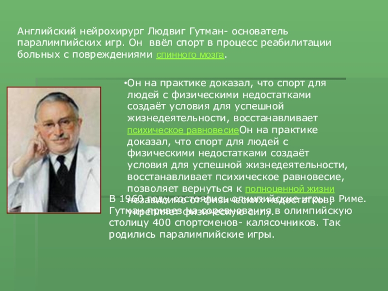 Гутман привез на соревнования в олимпийскую столицу 400 спортсменов- калясочников. Так родились паралимпийские игры.