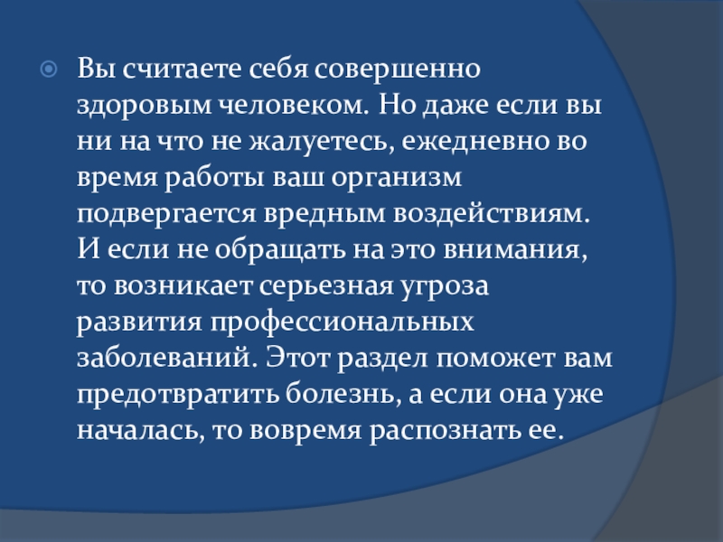 Слайд 2Вы считаете себя совершенно здоровым человеком. Но даже если вы ни