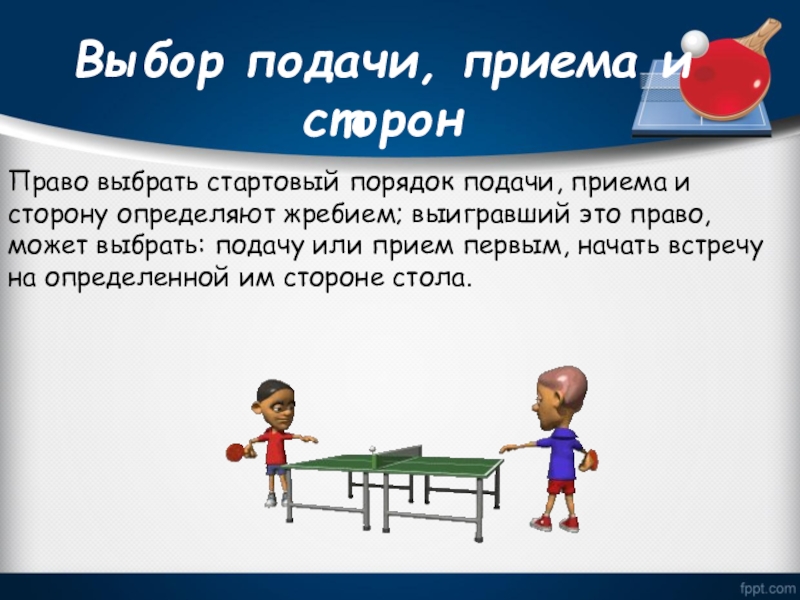 сторону определяют жребием; выигравший это право, может выбрать: подачу или прием первым, начать встречу на определенной им стороне стола.