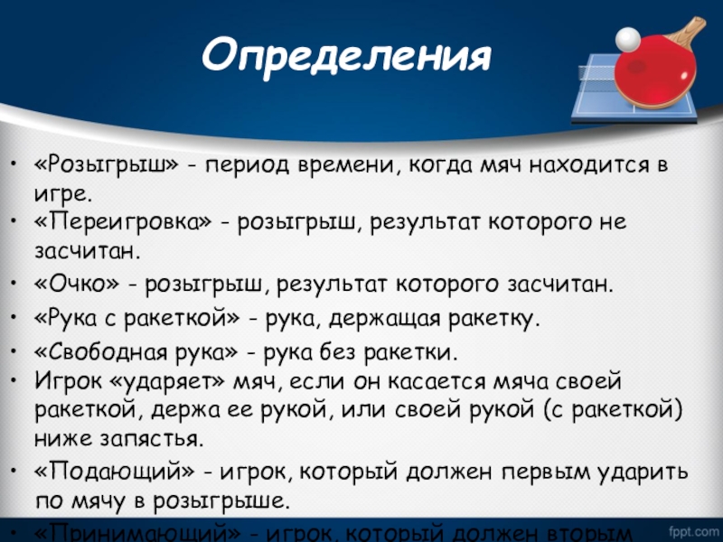 Игрок «ударяет» мяч, если он касается мяча своей ракеткой, держа ее рукой, или своей рукой (с ракеткой) ниже запястья.