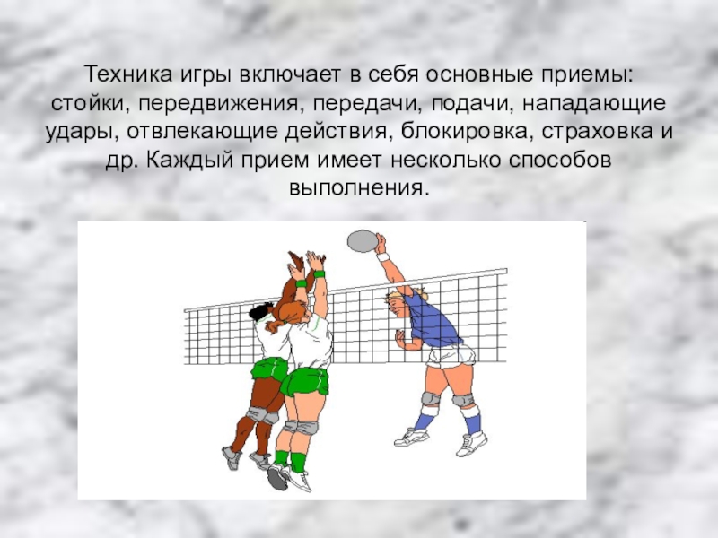 Техника игры включает в себя основные приемы: стойки, передвижения, передачи, подачи,