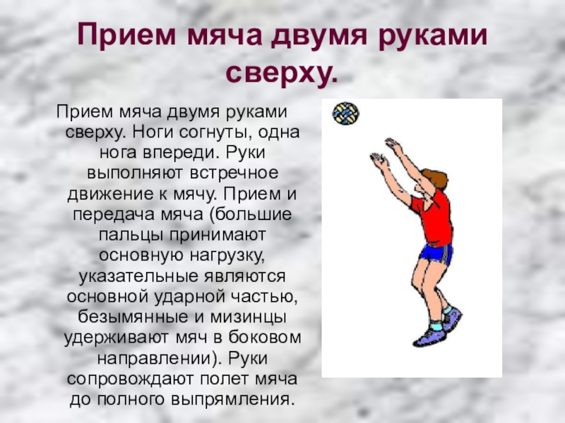 Прием мяча двумя руками сверху. Ноги согнуты,