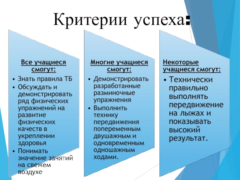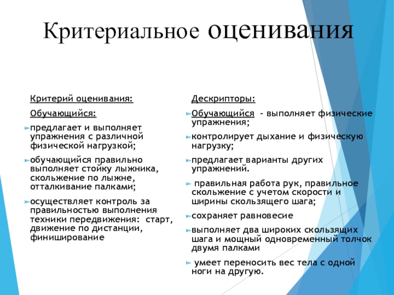 правильная работа рук, правильное скольжение с учетом скорости и ширины скользящего шага;
